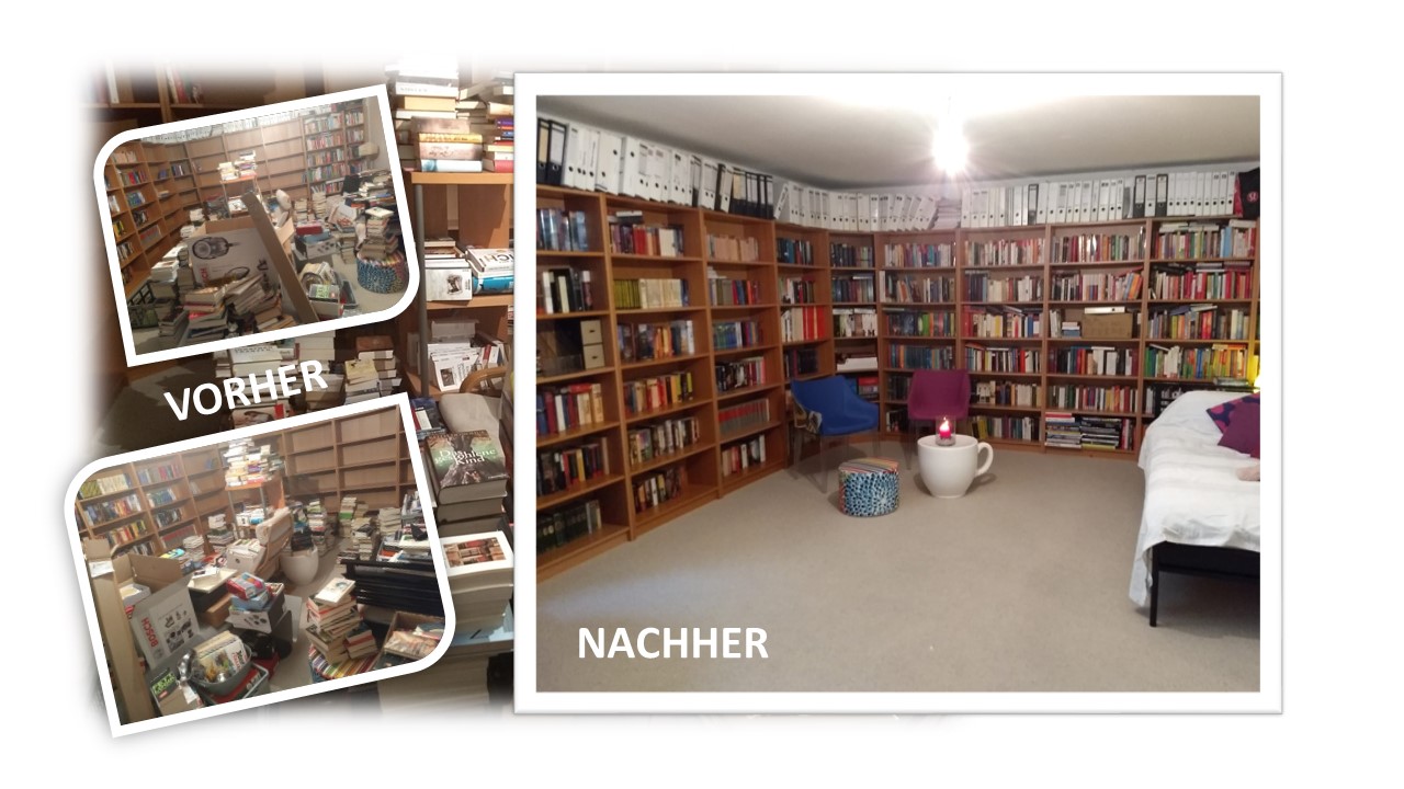Büroraum-Keller ordnen und wohnlich einrichten, das "zu viel" entsorgen.